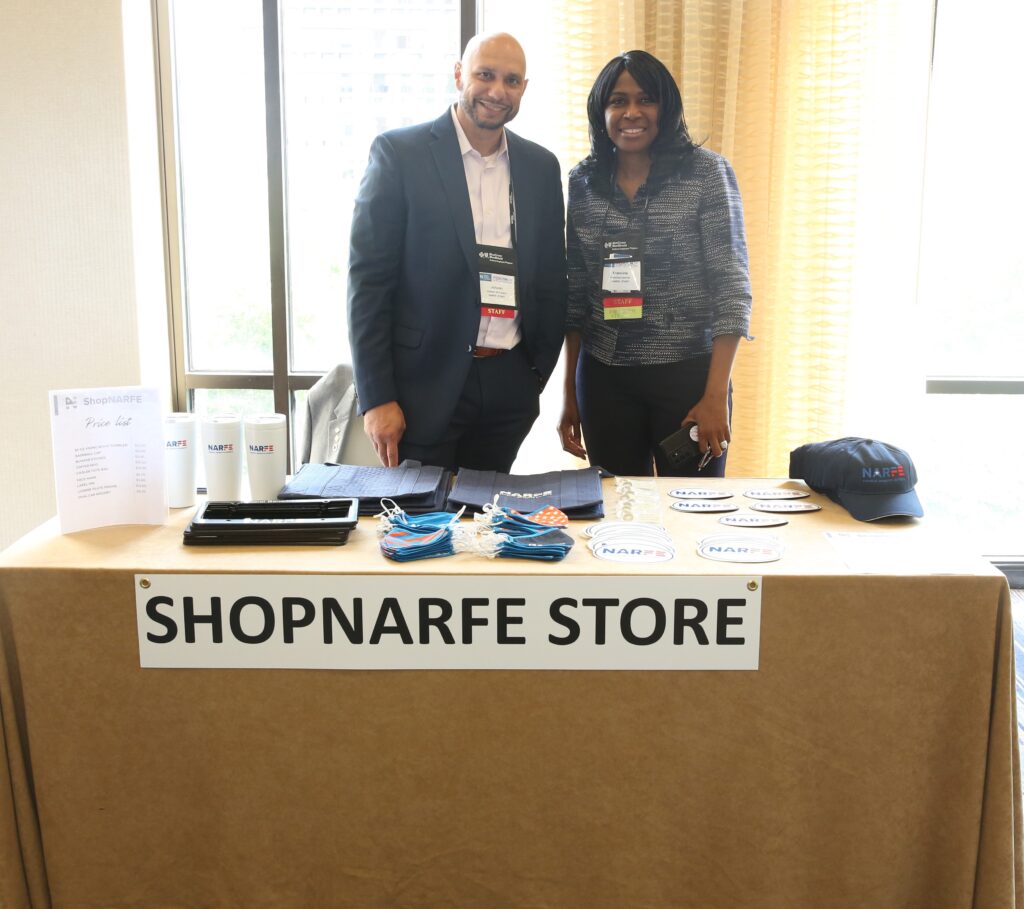 Johann De Castro, NARFE senior vice president of finance and administration, and Francine Garner, senior manager of business development, at the ShopNARFE table at FEDcon24. Our table swamped all conference! Thank you to all attendees who grabbed some extra merchandise.