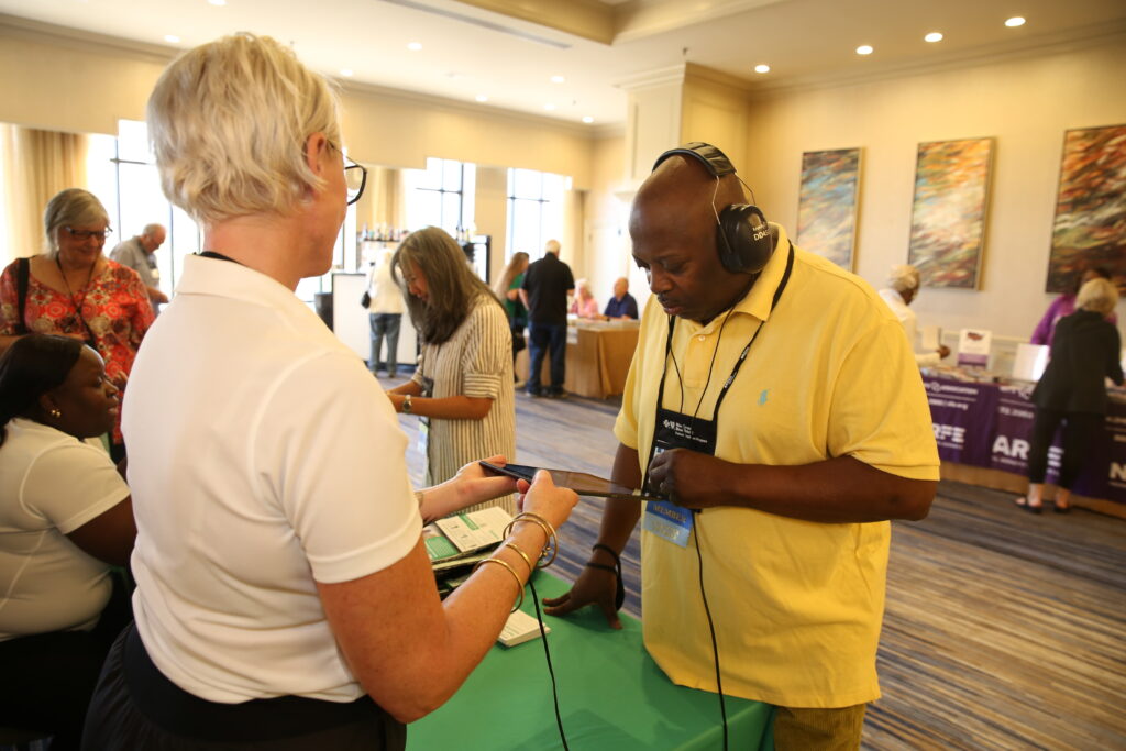 A FEDcon24 attendee takes an eye exam at the Blue Cross Blue Shield exhibitor table.