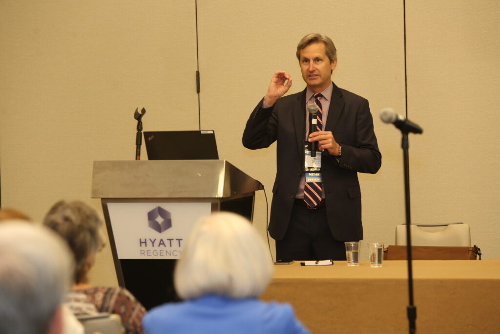 John Hatton, NARFE staff vice president of policy and programs, points to a graphic on screen while leading the FEDcon24 track session “Advocacy Update: What’s the Latest and What’s Ahead.”
